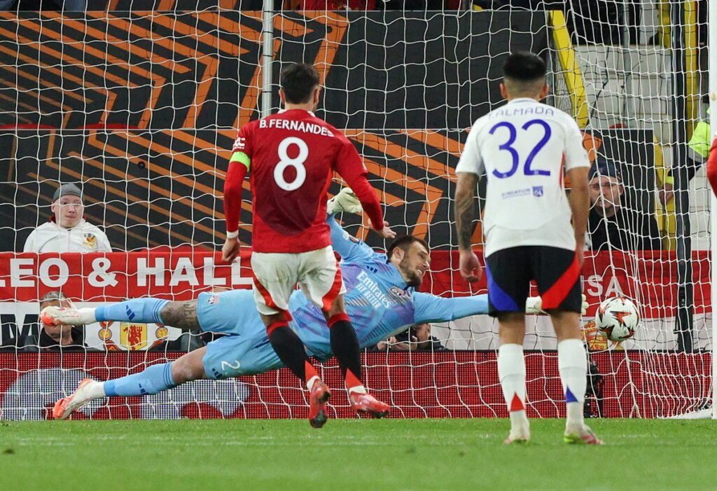 Bruno Fernandes marca em cobrança de pênalti contra o Lyon